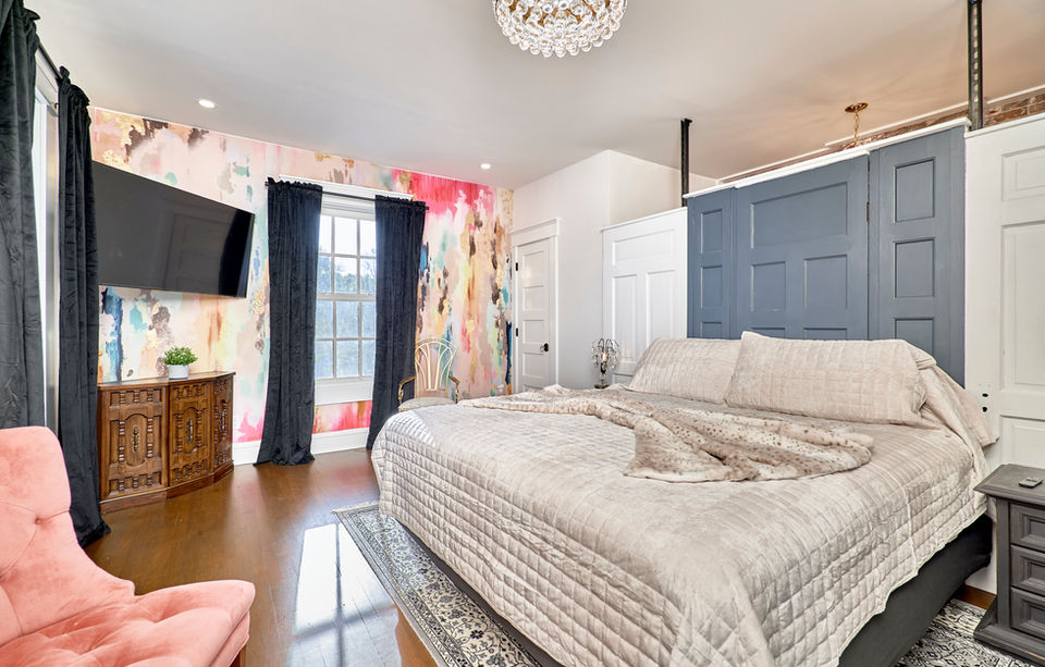 Upon entering this space, you will be greeted by a lively oasis adorned with vibrant splashes of color, adding a touch of glamour and sparkle. The exposed brick's charm, combined with various textures, showcases the unique character of this unit. An original headboard crafted from antique doors serves as a distinctive wall feature and focal point for the king-size bed. A cozy workspace offers a picturesque view of French St. The refinished hardwood flooring, dating back to the building's origins, is complemented by tiles that pay homage to the countless individuals who once walked on this floor over a century ago.
